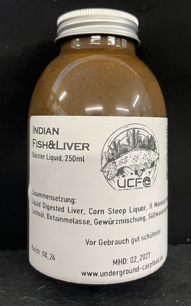 Das passende Liquid zu den Indian Fish&Liver Boilies! Wie alle Liquids aus dem Hause UCF finden sich auch hier viele der attraktiven Inhaltsstoffe, die im Boilie enthalten sind, auch im Liquid wieder. Dies gewährleistet zum einen einen hohen Wiedererkennungswert und zum anderen eine hohe Funktionalität. Die so abgestimmten Liquids enthalten z.B. verschiedene Partikel/Mehle, die durch die Zusammensetzung des Liquids teilweise an die Oberfläche streben und dann langsam wieder absinken.